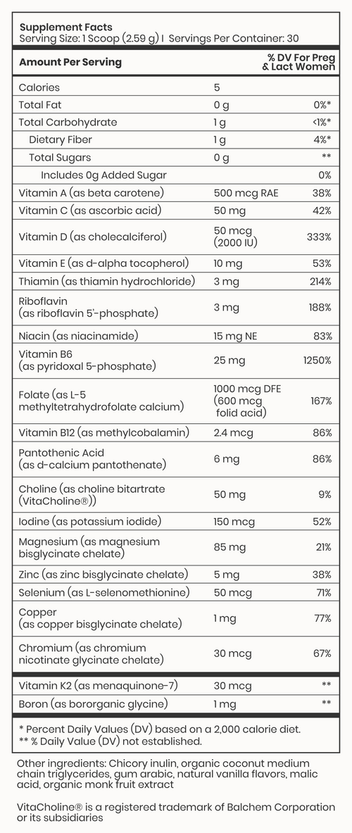 Made for those 1st trimester days when swallowing pills seems impossible. With a subtle hint of vanilla, our prenatal smoothie mix was designed to blend perfectly into a smoothie or milk of choice, cover your nutritional baseline needs and support baby's early development. Please note: This blend is not designed to fully replace a prenatal vitamin as it does not contain iron–but can be used as-need for those especially difficult days.