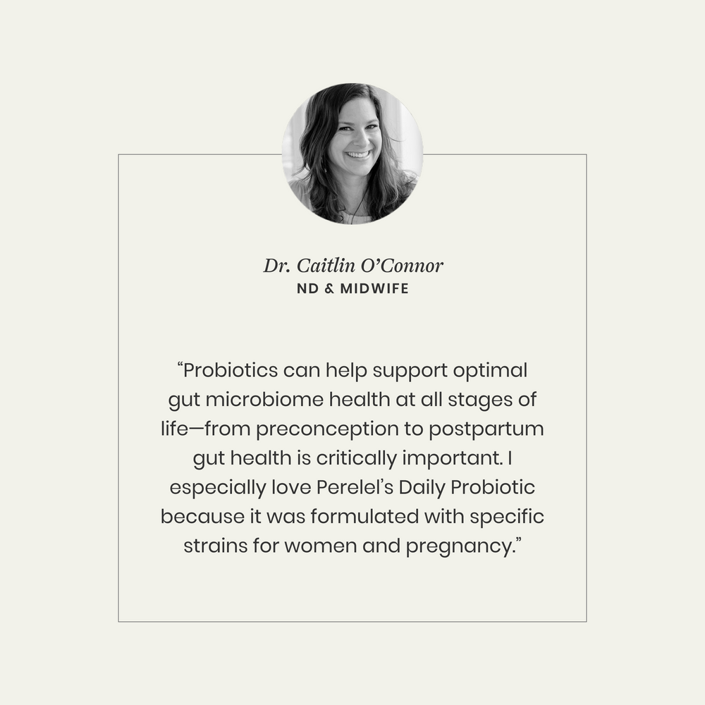 “Probiotics can help support optimal gut microbiome health at all stages of life—from preconception to postpartum gut health is critically important. I especially love Perelel’s Daily Probiotic because it was formulated with specific strains for women and pregnancy.”Dr. Caitlin O’Connor