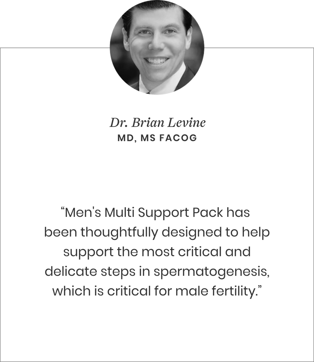 Fertility is 50/50. Support your partner’s general and reproductive health with a complete daily vitamin routine designed to help support the most critical and delicate steps in spermatogenesis.