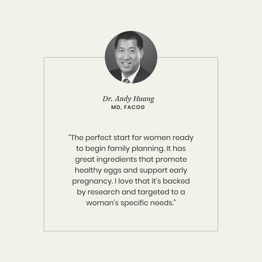 Support your fertility and prepare your body for pregnancy. Formulated by a panel of leading obstetricians and reproductive endocrinologists, each clinically-proven daily pack includes a full-spectrum prenatal vitamin, CoQ10 for antioxidant support, added omegas and additional folate. Each research backed ingredient is targeted to your fertility focused needs and can support egg health and ovulation.*