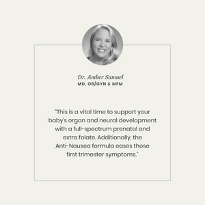 "This is a vital time to support your baby's organ and neural development with a full-spectrum prenatal and extra folate. Additionally, the Anti-Nausea formula eases those first trimester symptoms."