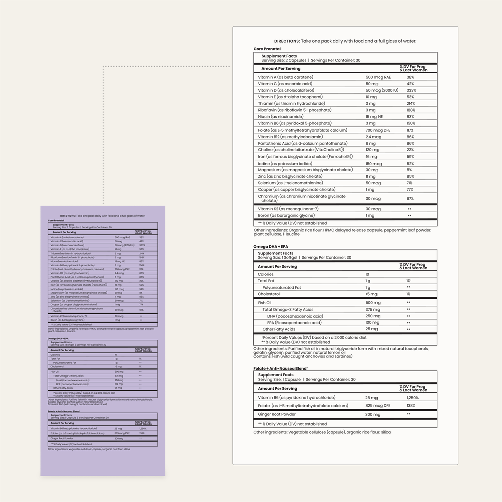 "This is a vital time to support your baby's organ and neural development with a full-spectrum prenatal and extra folate. Additionally, the Anti-Nausea formula eases those first trimester symptoms."