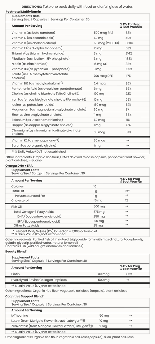 Support your body up to 5 years post-birth (which is actually how long the postpartum period technically lasts!) with a complete daily vitamin routine. Formulated by a team of leading OB/GYNs and doulas, each daily pack includes a postnatal multivitamin, omega DHA + EPA, cognitive support blend* and beauty blend* for your body’s changing needs.