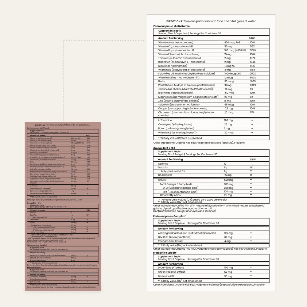 Developed by top OB/GYNs and women's health experts, the Perimenopause Support Pack is an all-in-one routine designed just for perimenopause, a chapter that lasts roughly four years (but can be up to a decade). Each daily sachet contains five capsules to support your daily nutrient needs, help relieve symptoms and support a healthy perimenopause transition.*